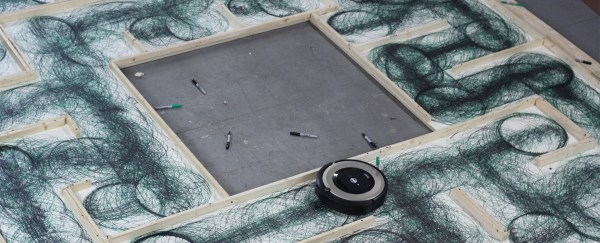 Dibujo realizado por aspiradoras Roomba a partir de su geolocalizacion. Intervencion en espacios privados donde se utilizan como limites para crear patrones de localizacion y pre diseño del área. La inteligencia artifical crea patrones de comportamientos para delimitar obstaculos. Estas aspiradoras utiliza la Inteligencia de localizaciones (también puede denominarse Inteligencia de ubicación): es el proceso de obtención de una visión significativa de las relaciones de datos geoespaciales para resolver un problema particular. La capacidad de entender o aprender, o la capacidad de aplicar conocimiento para manejar el entorno.