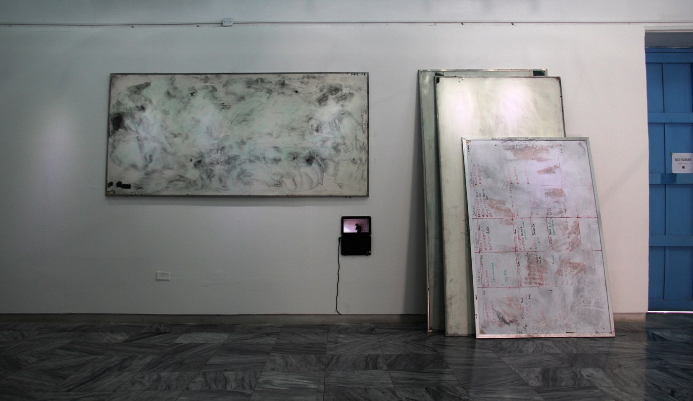 Obra en proceso, instalación, pizarras, dactilograma/ Work in progress, installation, slates, dactilograma.