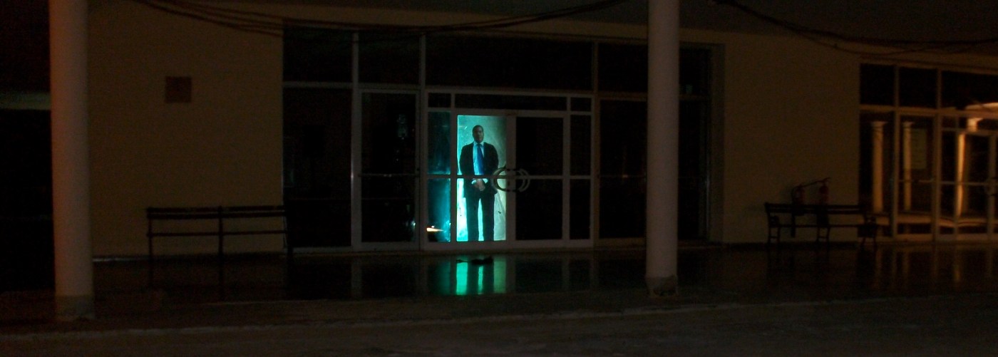 This work reproduces a picture with holographic sense, the projection of an individual standing in a vertical position, on his back (as if nothing happens). When you approach to him, he will take a front position, and he don´t change it until he’s alone. The interface is activated during non-workable time from 5:30 p.m. to 7:30 a.m., time when, by assumption, the Institution is in a non-functional state. The virtual picture of this agent creates a psychological process of presence.