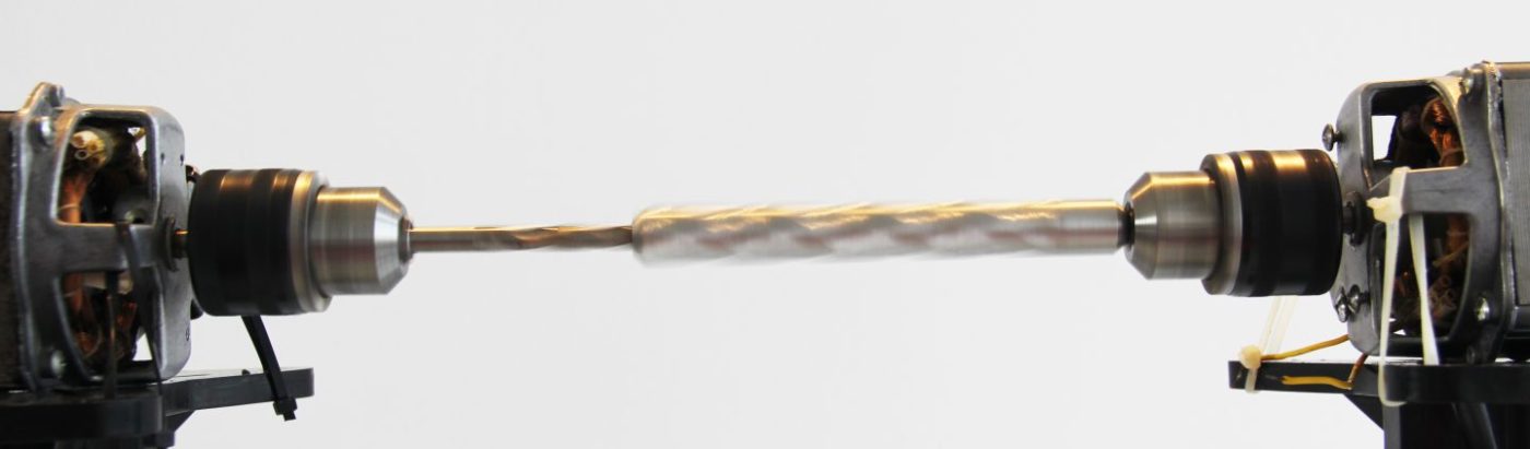 Inside the room, it can be listened the noise of the rubbing between both drills. The work born from the concept of construction and deconstruction. Like a metaphor of effect to something or for something. The drill has the utility of drilling, it is a tool to transform or mould something. It is established a relationship between drill and power instrument.